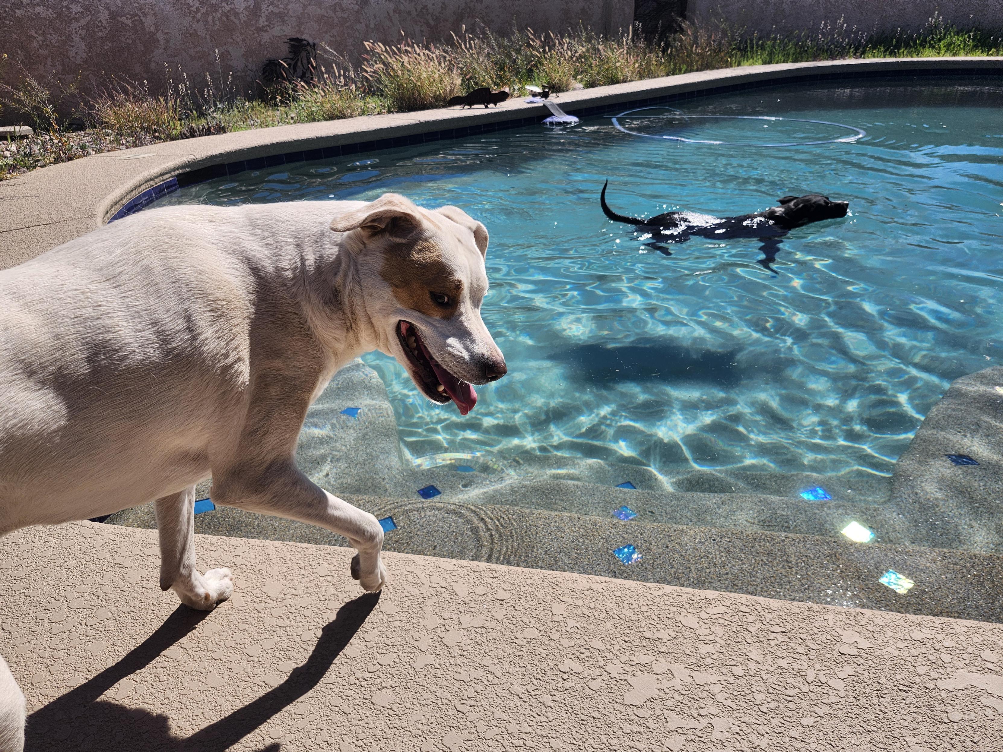 I am so so so tired so it's time to say #GoodNightFriends with a photo of #Gracie enjoying her post-walkies cold plunge and #Niko enjoying not swimming.