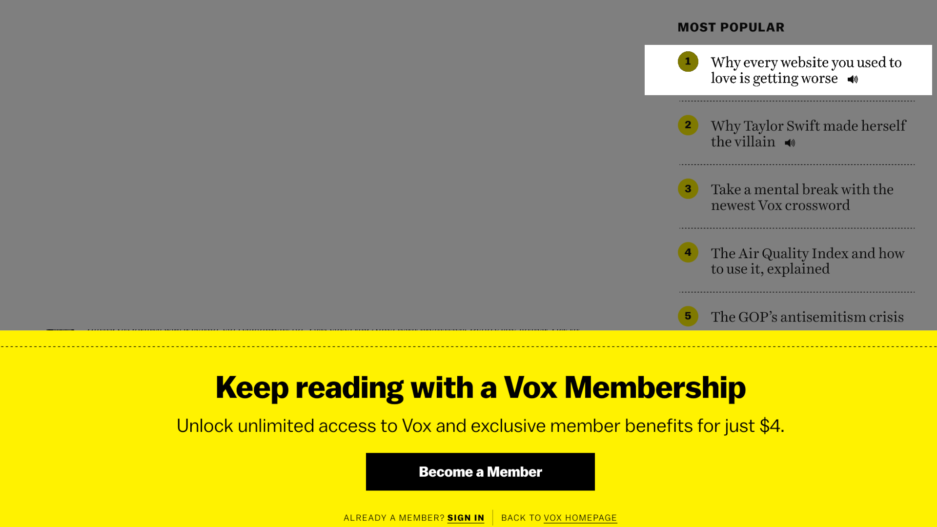 I would love to read "Why every website you used to love is getting worse" but unfortunately there's a non-removable "KEEP READING" banner which blocks clicks on the page.