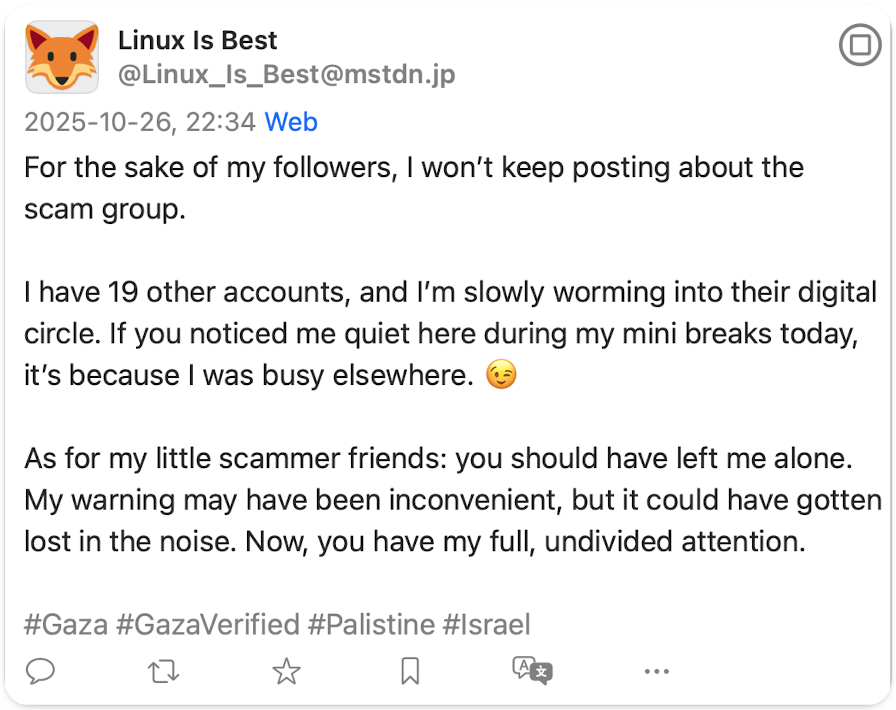 CC @staff and all other moderators of #mastodon servers who see this: Targeted harassment of our initiative (Gaza Verified) for trying to help Palestinians that are enduring genocide in Gaza.
