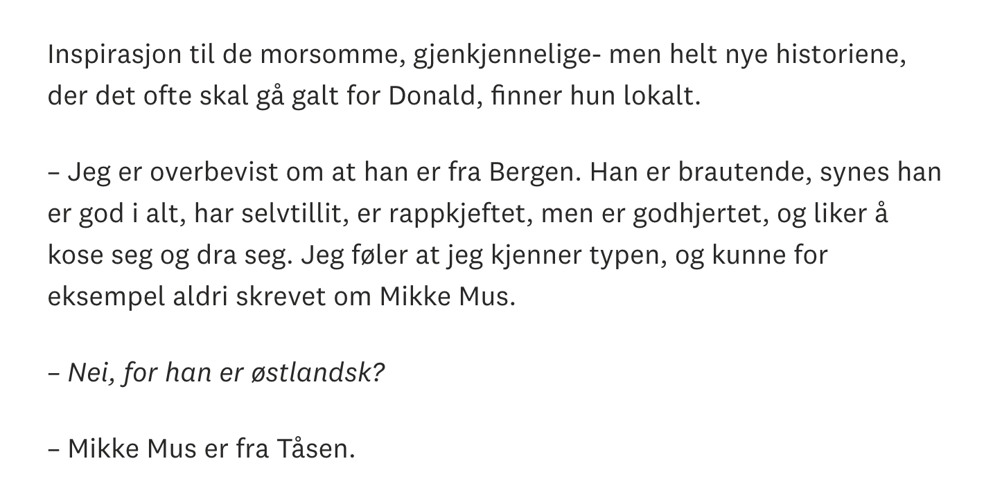 Du får det knapt meir #Bergen enn dette, når nysmidd Donald Duck-forfattar Ragnhild Holmås skal skildre skilnaden på Donald og Mikke Mus.