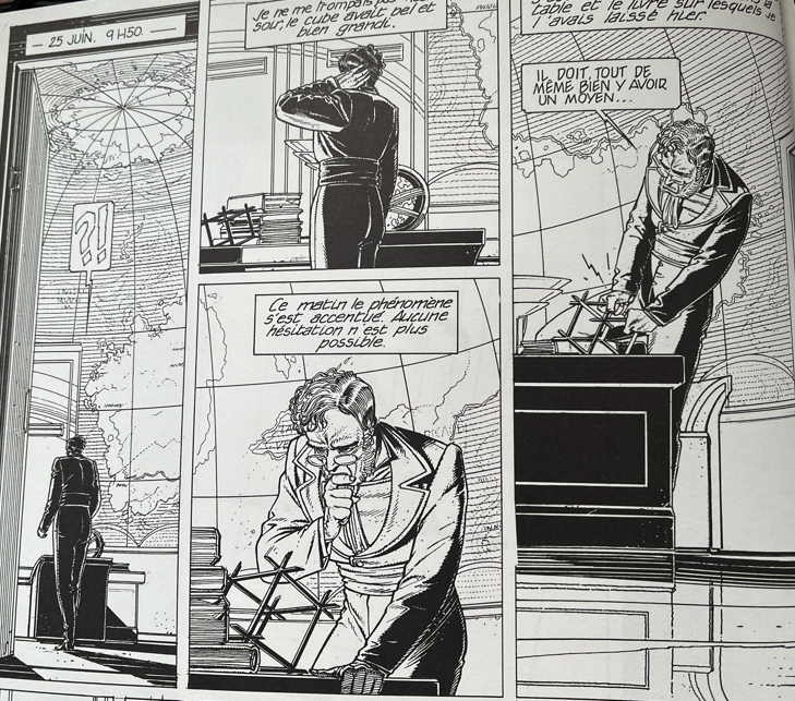 #silentSunsday #BD #Moebius 'Le garage hermetique' is a weird loosely bound collection of story-threads. Stuff happens and are not explained, building a world with a lot of flavor with new dimensions added in every two-page segment. The author writes that an editor saw the first two pages and wanted more, but he had lost the pages when he had to draw that, which explains why there are some many jumps in the story.To fix this there is inserted Resumes that comments on the story in a non-standard way adding to the flavor. The world is artificial with three levels that you can travel through by passing certain doors - the garage in the title.Story lines center on Major Grubert and his people, Jerry Cornelius and the person from the first pages - engineer Barnier (that halfway thorough get rescued by a masked figure with a bow).Some of the characters gets sidelined before the end where the plot is revealed to be a fight over the artificial world and a plan to make it real