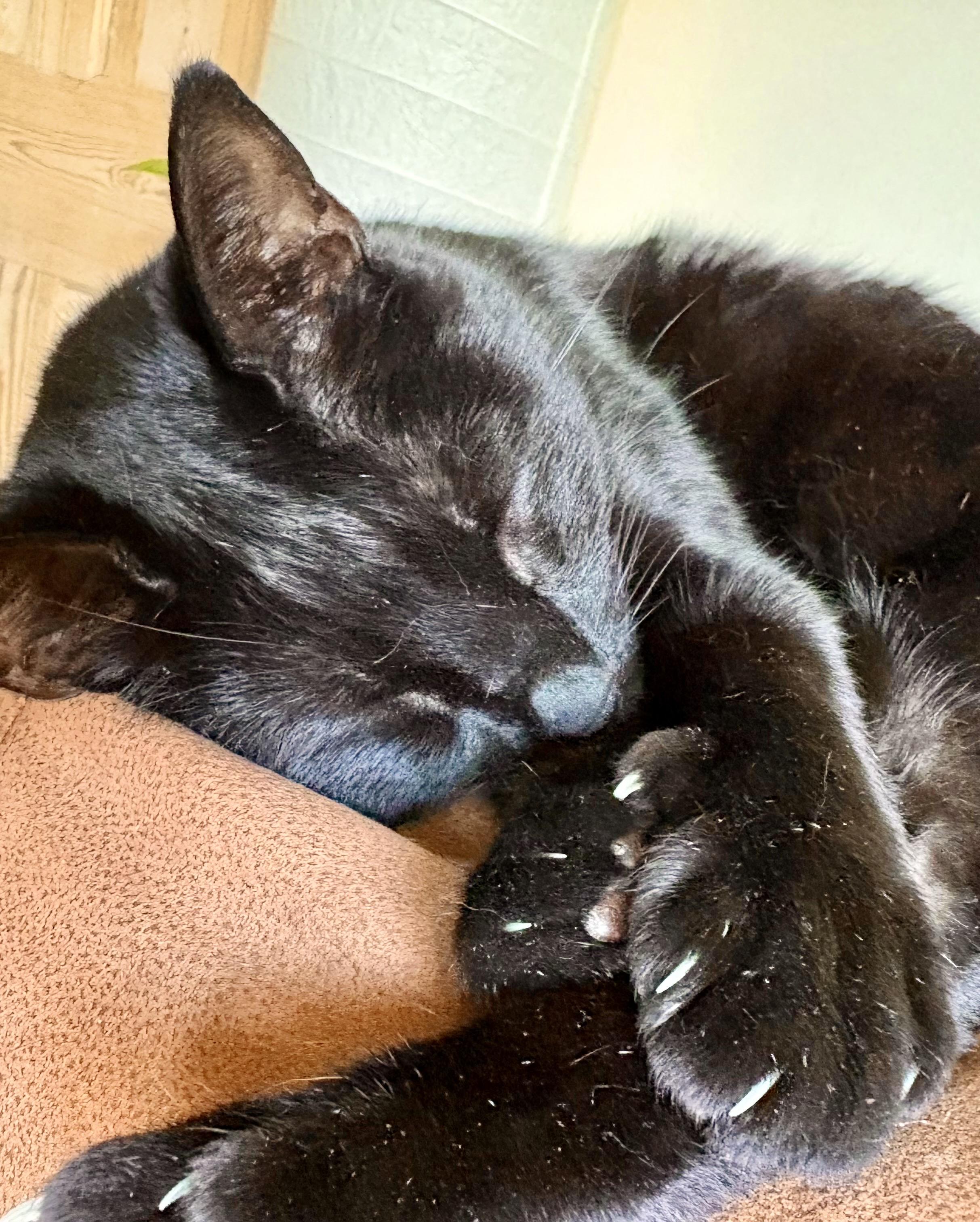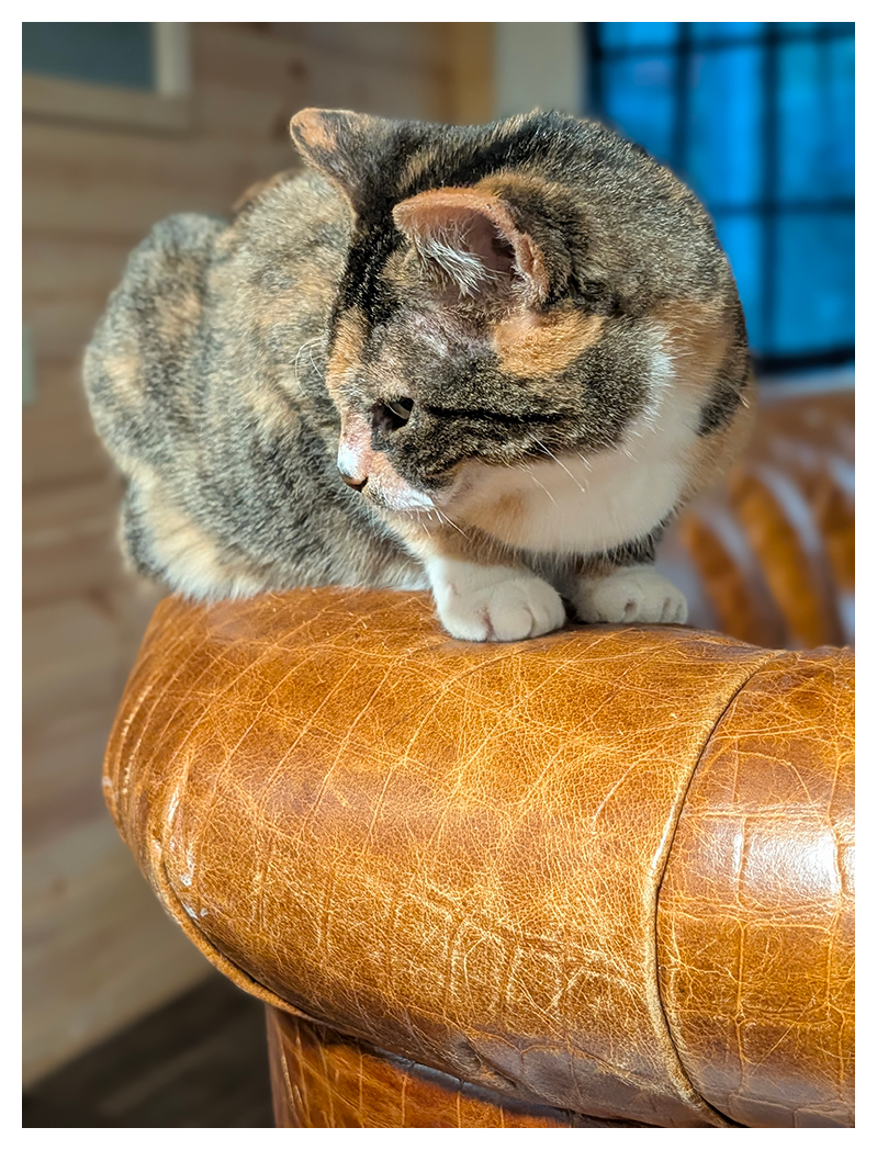 Molly, having a lazy day - scrolling, commenting on bird videos, getting into arguments with other cats