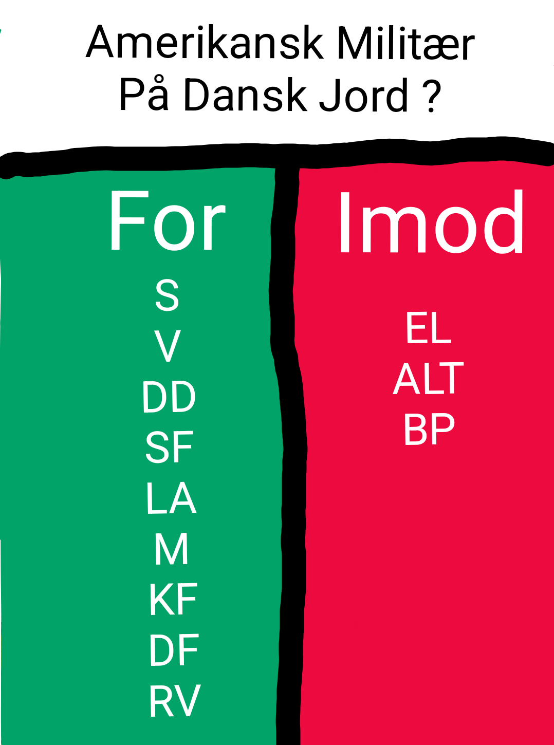 Partierne stemte således.For Amerikansk Militær på Dansk Jord:Socialdemokratiet (S)Venstre (V)Danmarks Demokraterne (DD)Socialistisk Folkeparti (SF)Liberal Alliance (LA)Moderaterne (M)Kristen Demokraterne (KD)Dansk Folkeparti (DF)Radikale Venstre (RV)Imod Amerikansk Militær på Dansk Jord:Enhedslisten (EL)Alternativet (ALT)Borgernes Parti (BP)