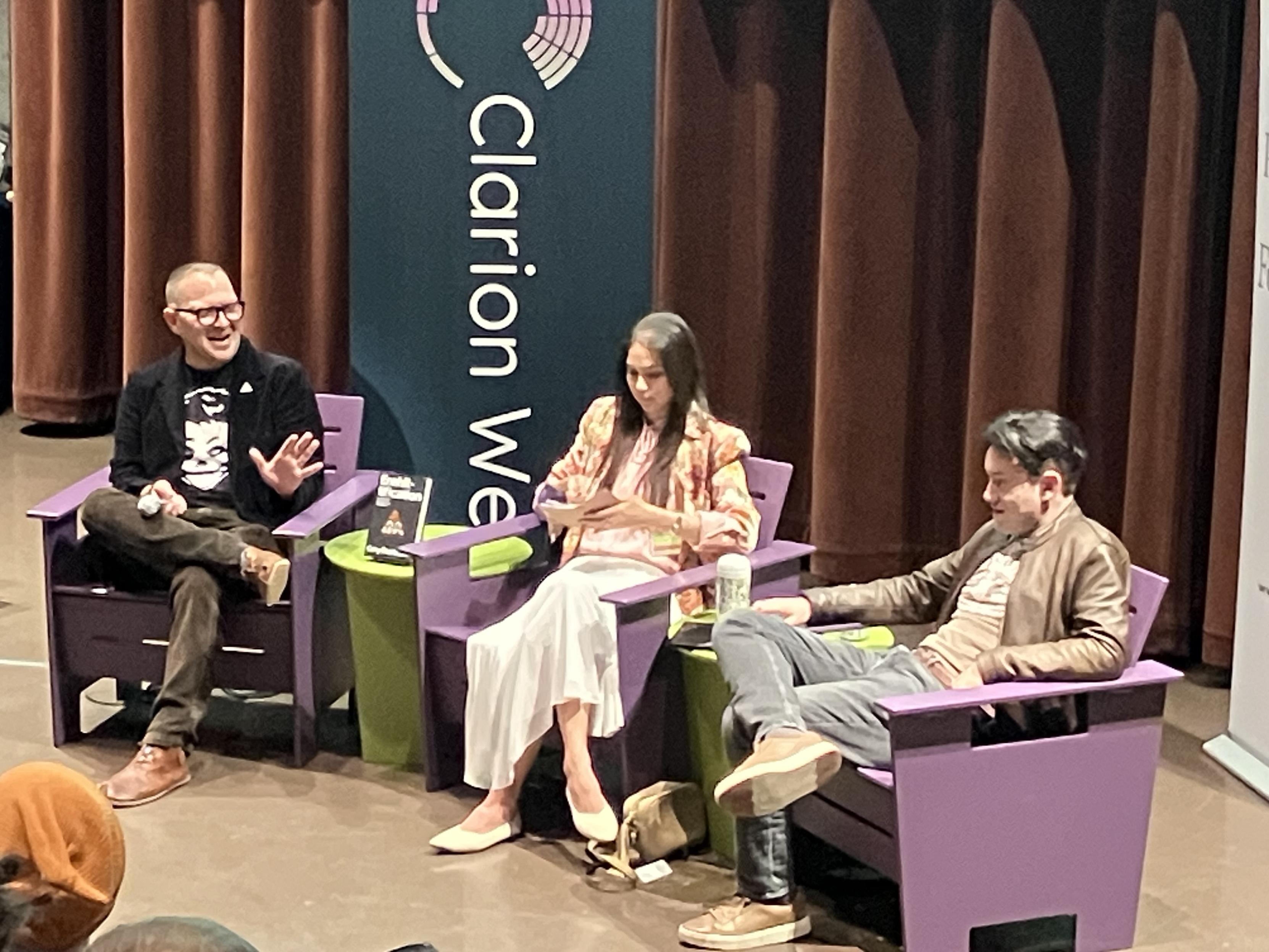 Cory Doctorow and Ed Zitron discussing #Enshittification with Whitney Beltrán moderating at the Seattle Public Library.