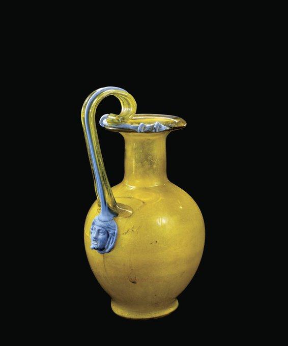 A beautiful yellow Roman glass pitcher with a splash of light blue appliqué for extra decoration.