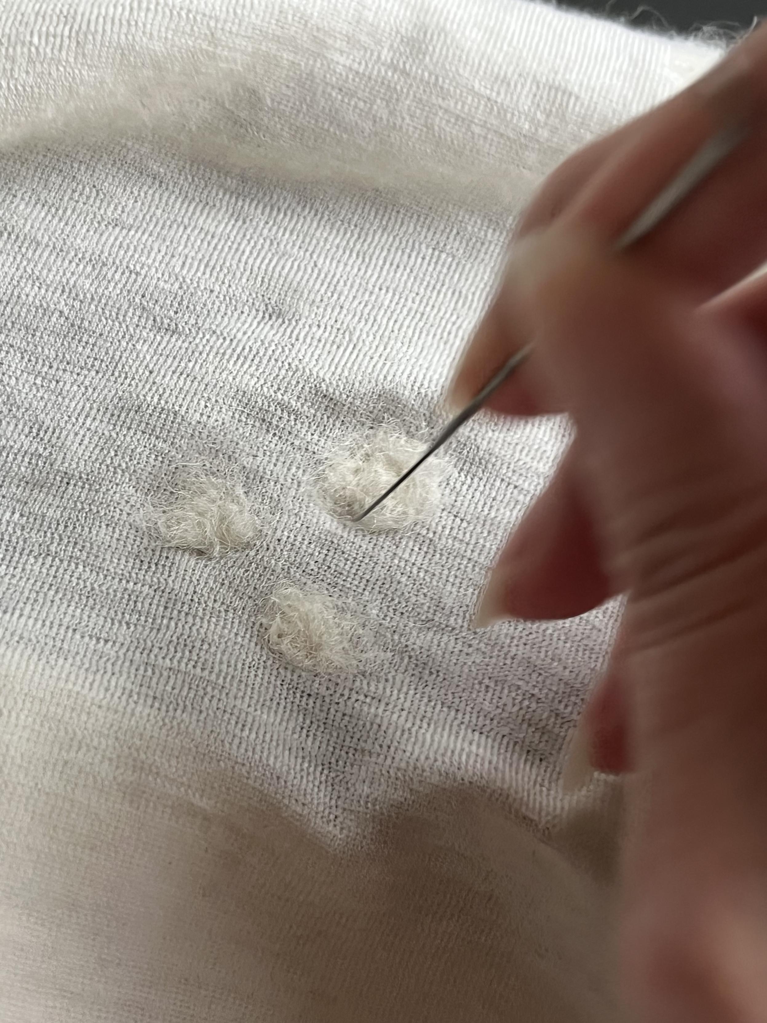 >blev grebet af stemningen og blandede en uld som passer til en tynd rullekravetrøje som jeg bruger ofte (og til pæn hverdag), men som har fået et par små huller. Min pink uld var for kold, men blander man noget varm orange i, så ligner den den varme pink ret meget. Så nu er der en lap på ærmet og på ryggen. Det blev ok.Min uld er købt for ca 15 år siden i søstrene grene. Jeg har brugt ca 1gr til denne reparation. Se foto. #nørklerier #repair