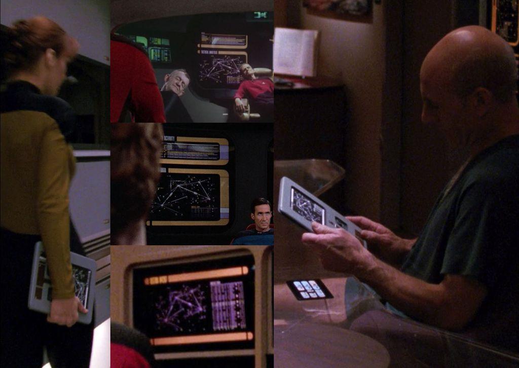 The large PADD with a star chart that Picard looks at in his quarters when Q is bugging him in the middle of the night in #StarTrekTNG's "Qpid"➡️ was previously seen in "Devil's Due"⬅️, held by Ensign Kellogg in a corridor.