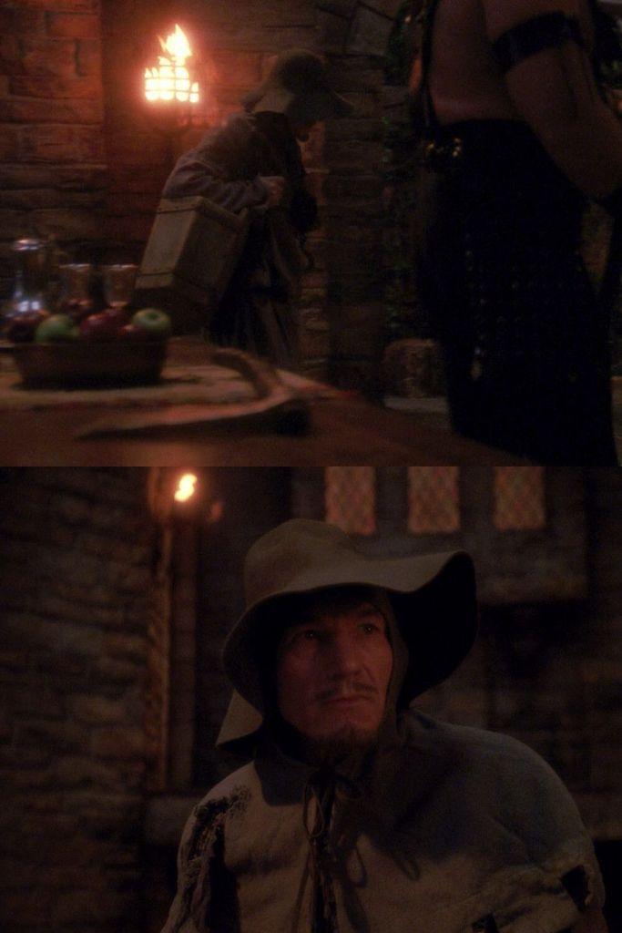 This is something that took me ages to notice: Picard is seen to be hiding undercover as a tinker at the end of the Nottingham Castle courtyard Vash/Q/Guy of Gisbourne scene in #StarTrekTNG's "Qpid"⬇️.
