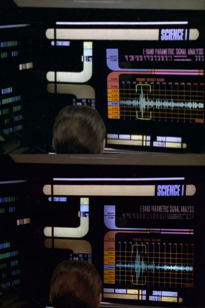 Here's a comparison of the E-Band Parametric Signal Analysis, as seen on the aft bridge Science I station in the original ⬆️ and remastered ⬇️ versions of #StarTrekTNG's "The Mind's Eye".
