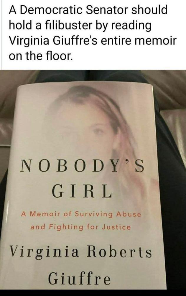 A democratic senator should hold a filibuster by reading Virginia Guiffre's entire memoir on the floor.