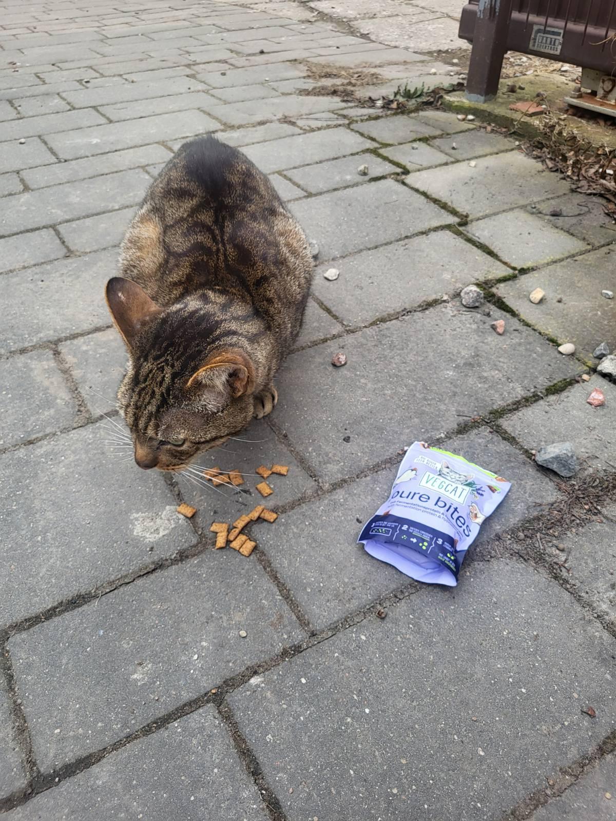 The kitty is eating the very first vegan cat treats that are out in the market.