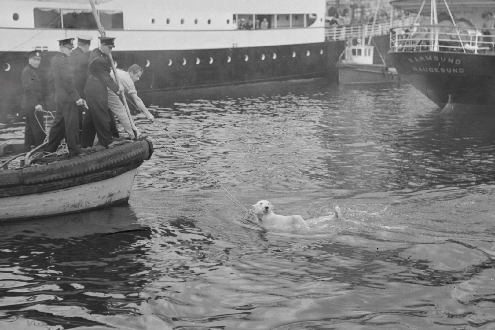 Well, in 1953, there _was_ a #PolarBear loose in #Bergen. Coming from the North, and supposed to be transferred to a ship going to a zoo Germany, mommy bear escaped and swam around the port for a while, before being recaptured and sent on – along with her two cubs. Quite the spectacle!