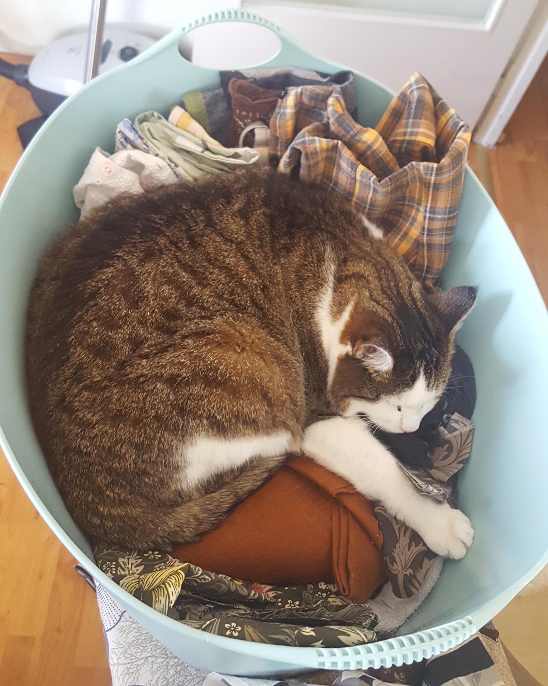 Cat report: All four cats continue being cats. The oranges have both been trying to convince the other they're the boss. Rudolf has retreated to his newest nest to relax afterwards. Pörri looks very cosy in my basket of ironing. Musti is currently napping on my bed, but there's laundry in the way of photos!