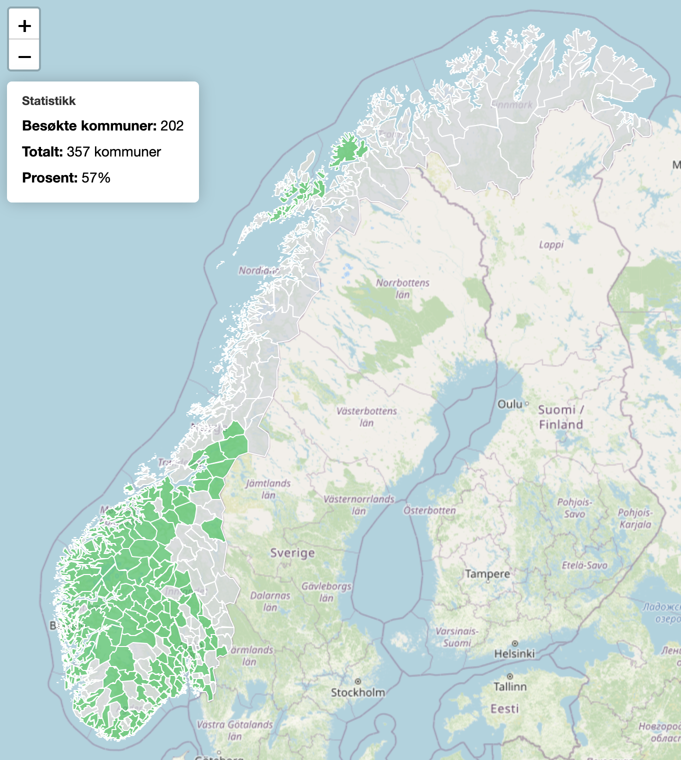Oppdatert til å vere interaktiv, og skilje mellom vore innom, overnatta, og budd (med ufyseleg lange URL-ar – den lagrar ingenting på serveren): https://ting.bgo.city/noregskart/?d=4:1,7:1,8:1,9:1,10:1,11:1,12:1,13:1,15:1,17:1,19:1,22:1,25:1,27:1,29:1,30:1,32:1,33:1,35:1,37:1,40:1,41:1,45:1,46:1,48:1,52:1,53:1,55:1,58:1,59:1,60:1,61:1,64:1,65:1,66:1,68:1,70:1,71:1,78:1,79:1,81:1,82:1,84:1,85:1,89:1,90:1,92:1,95:1,96:1,97:1,99:1,101:1,103:1,104:1,106:1,108:1,112:1,113:1,114:1,116:1,118:1,120:1,124:1,127:1,129:1,133:1,134:1,135:1,136:1,138:1,139:1,140:1,141:1,142:1,143:1,144:1,145:1,147:1,150:1,154:1,155:1,156:1,158:1,159:1,160:1,161:1,163:1,165:1,168:1,169:1,171:1,173:1,175:1,176:1,177:1,178:1,180:1,181:1,182:1,184:1,185:1,187:1,194:1,195:1,198:1,200:1,201:1,202:1,203:1,205:1,208:1,209:1,211:1,212:1,215:1,216:1,219:1,223:1,224:1,226:1,228:1,229:1,230:1,231:1,233:1,234:1,240:1,242:1,243:1,244:1,246:1,249:1,253:1,257:1,258:1,259:1,260:1,261:1,262:1,263:1,264:1,265:1,266:1,267:1,269:1,270:1,272:1,275:1,276:1,277:1,279:1,280:1,281:1,282:1,283:1,285:1,286:1,287:1,288:1,292:1,293:1,295:1,298:1,301:1,304:1,305:1,306:1,307:1,308:1,309:1,310:1,314:1,315:1,316:1,317:1,323:1,324:1,325:1,326:1,330:1,331:1,332:1,333:1,334:1,335:1,336:1,341:1,342:1,345:1,346:1,351:1,353:1,354:1,355:1,356:1