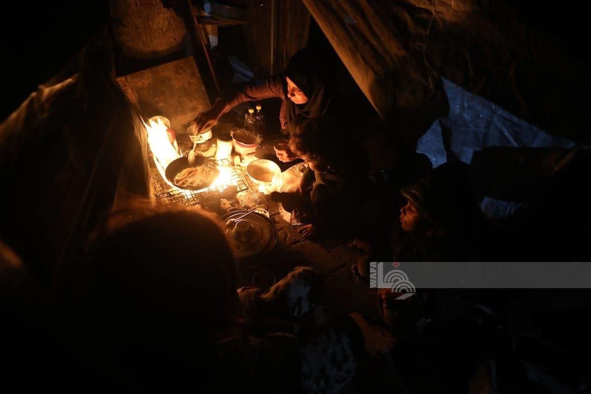 ممكان داخلي مضاء بشكل خافت، ربما سكن أو مأوى مؤقت، يظهر عدة أشخاص يجتمعون حول مصدر ضوء صغير. شخص واحد يستخدم أداة لطهي في مقلاة مشتعلة فوق الضوء، والتي بدورها تُضيء عناصر أخرى مثل الأطباق والطبق والعلبة. يتواجد آخرون بالقرب من منطقة الطهي. يلقي الضوء ظلًا على المشهد، revealing مزيجًا من القماش والمواد غير المتجانسة. في الزاوية السفلية اليمنى، يظهر النص "WANA" فوق شعار دائري.