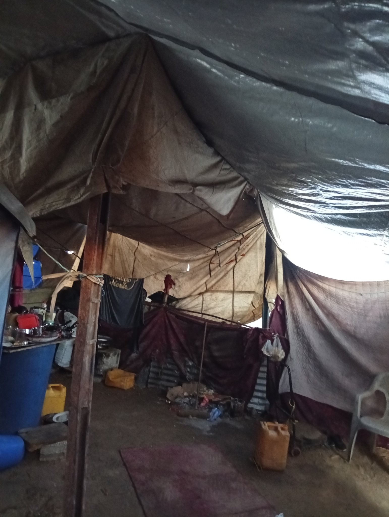 داخل هيكل تلة جلوس مُبسط، مع جدران من القرميد الداكن والرمادي، وأعمدة سقف رمادية، تتربع أشياء متنوعة. يوجد وعاء بنفسجي مزين بالخرسانة، مع أوعية وأكواب أخرى يقف على يساره بالقرب من قضيب خشبي. تقع ساري من القماش الأحمر المرجاني في المنتصف، مع أكياس وأكواب أسفله. إلى اليمين، يظهر مقعد أبيض بلاستيكي، بجانب دلو زجاجي بني، على الأرضيات الترابية، بالإضافة إلى سجادة زرقاء. يحتوي المكان على عناصر أخرى مثل حاويات زرقاء، صندوق أصفر صغير، وأشياء متنوعة أخرى.Provided by @altbot, generated privately and locally using Qwen3-Vl:30b