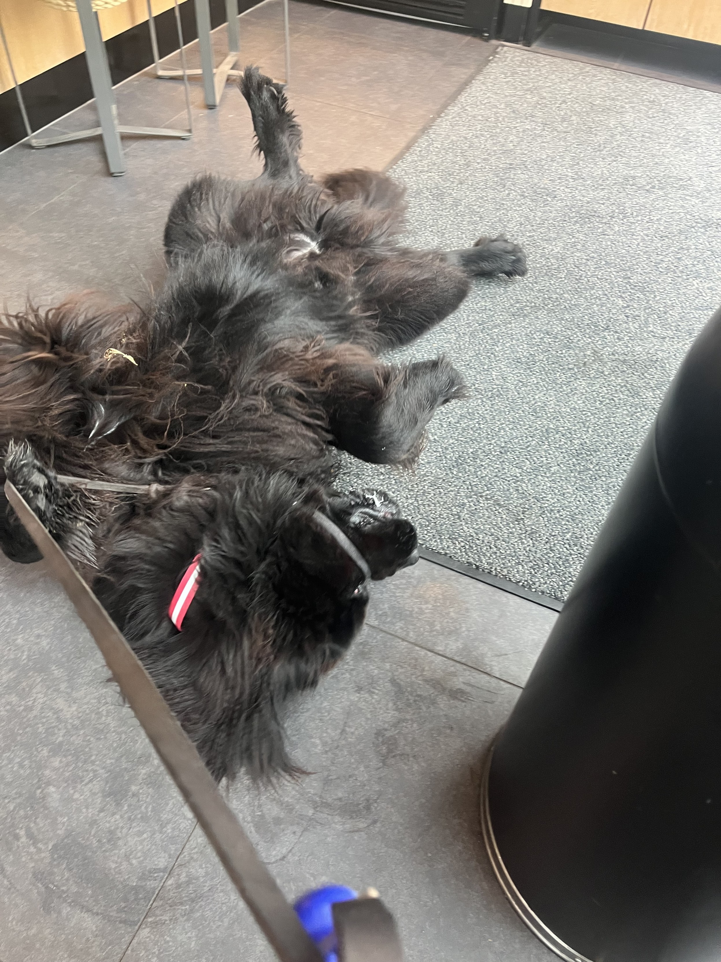 Odin luxuriating in the Starbucks, waiting for tourists to stumble over him and praise him for it #dog #dogs #dogsofmastodon l
