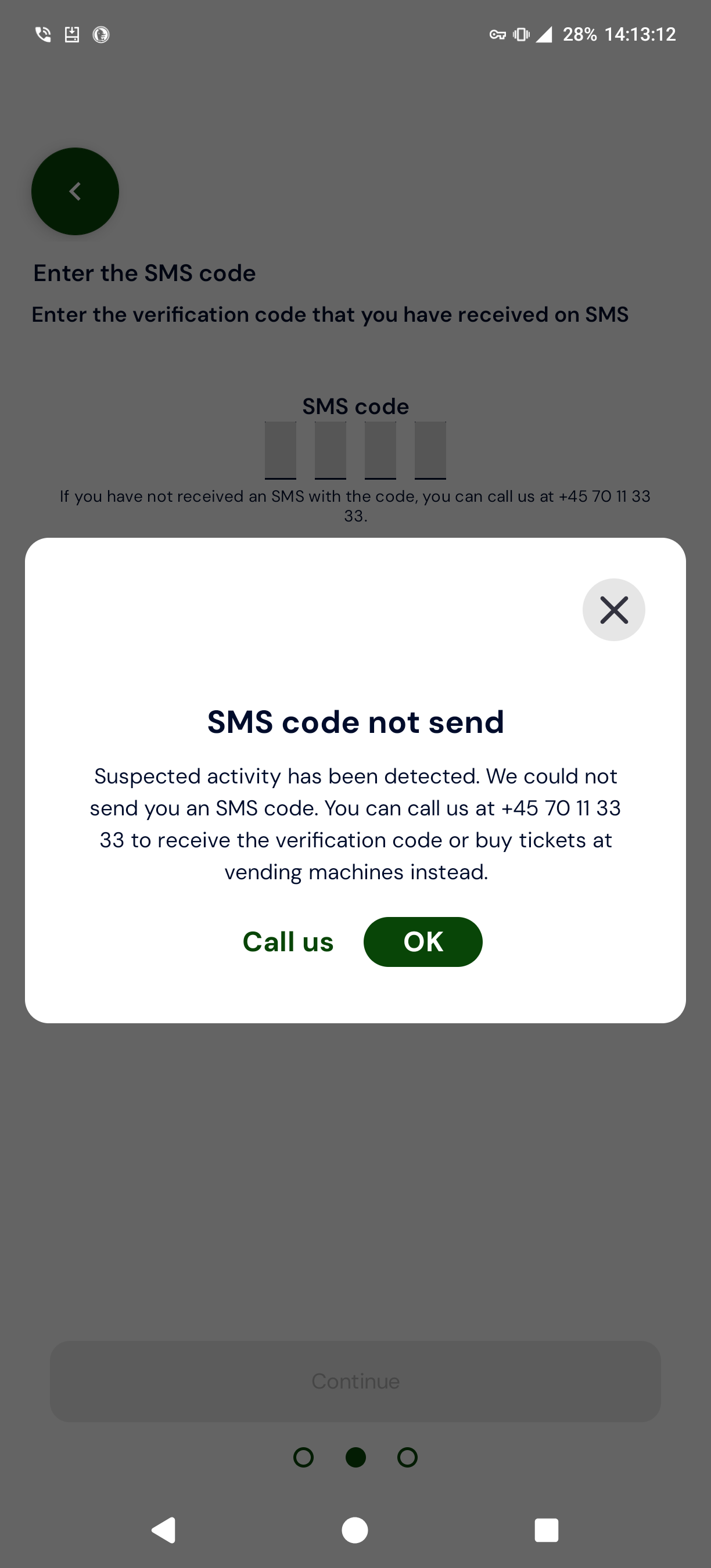 Jeg kan ikke få lov at komme i gang med Rejsebillet-appen, fordi jeg tilsyneladende gjorde noget mistænkeligt ved at indtaste mit telefonnummer.