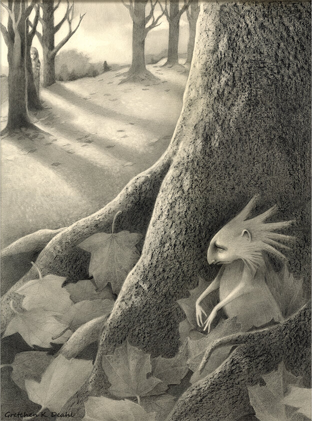 The Enchanted Forest. In the hidden corners of the world, sweet mysteries abound. NOTE: I created this piece quite a while ago, using a rubbing technique (a block of concrete) to get the texture of the tree bark.