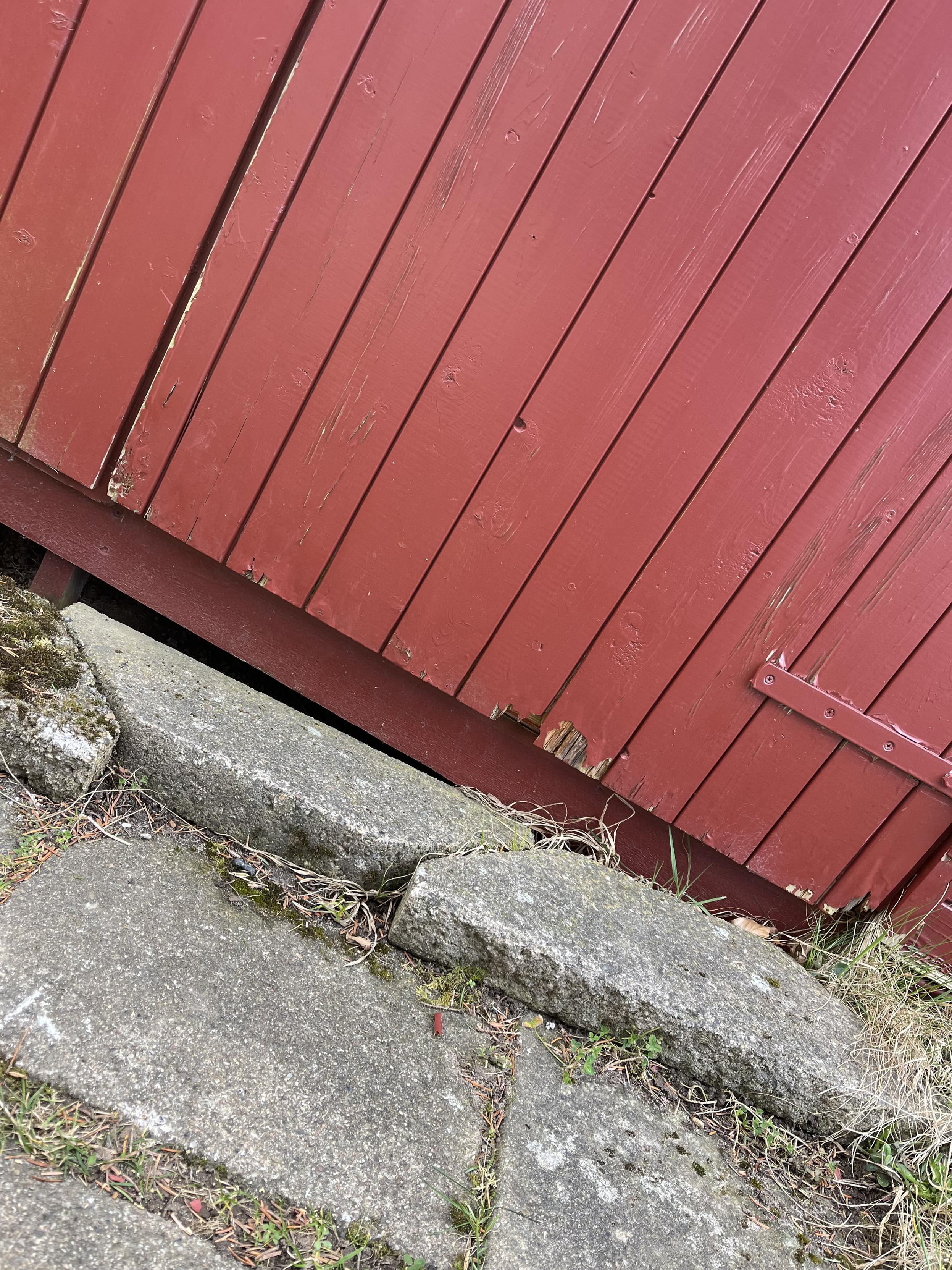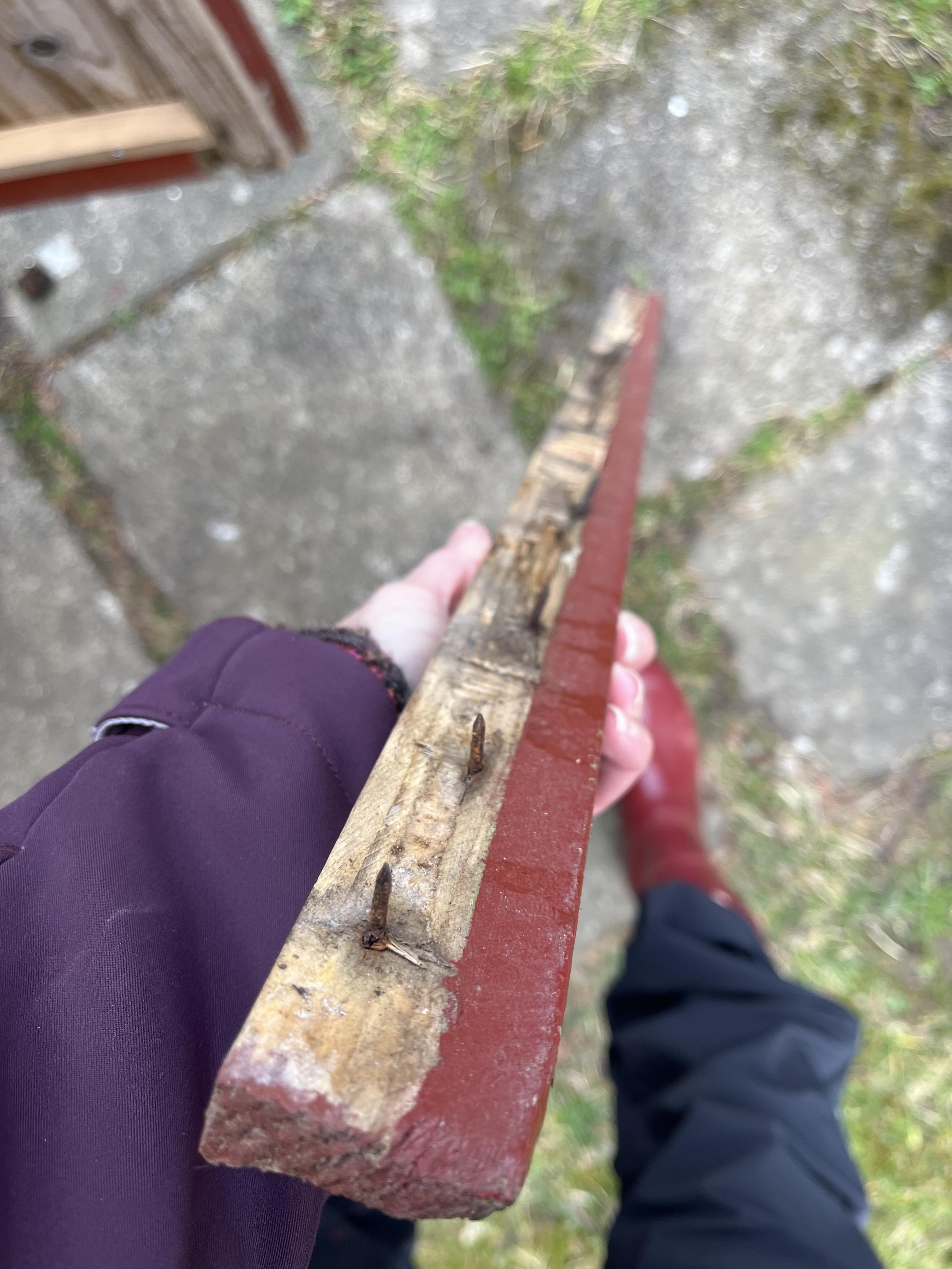 Lynreparation af døren til skuret som er mørnet forneden. Men nederste tværpind faldt af. Jeg fandt to rester (altid gem rester af træ!) som passede nogenlunde: ny nederste tværpind sat på og lidt beskyttelse bag på de dele af dørens træ, som bør skæres af og erstattes. Engang. #repair #nørklerier