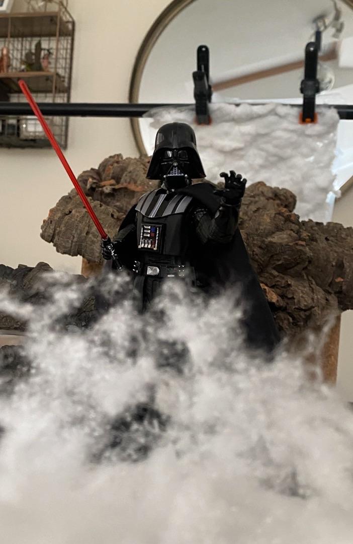 All shot practically (except the lightsaber which I had to digitally add a glow too) cotton wool for the fire lit with an orange light & cotton wool for the sky. An old piece of log for the mountains.