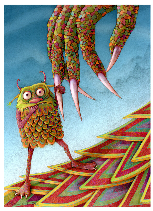 Baby monsters are even harder to find than the elusive "baby" pigeon. Very few folks can say that they've seen them, let alone created their portraits. I have been lucky. As you might imagine, monster parents can be a bit protective. Mothers in particular. They consider us (humans) more than a bit strange and potentially dangerous. It took most of my free time, lots of monster "treats" and carefully followed Monster Etiquette to befriend just a few of them. Even then, I felt a bit nervous and on edge as I made sketches of their most beloved offspring. It is always a good idea to remind oneself that monsters are ultimately unpredictable creatures, and should be given proper respect at all times.