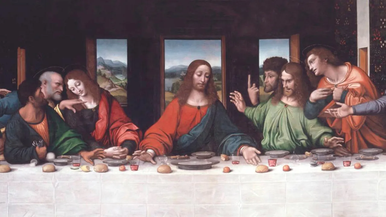 Famous painting of a chief surgeon eating lunch in the cafeteria with hospital staff.