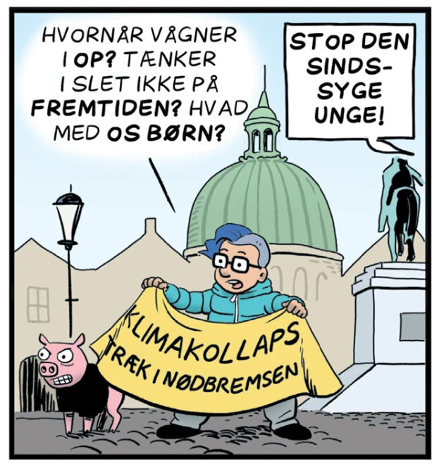 Dagens stribe (som teknisk set er morgendagens stribe) går ud til de brave unge fra Nødbremsen der kæmper for klimaet og fremtiden på trods af omgivelsernes fordømmelse.