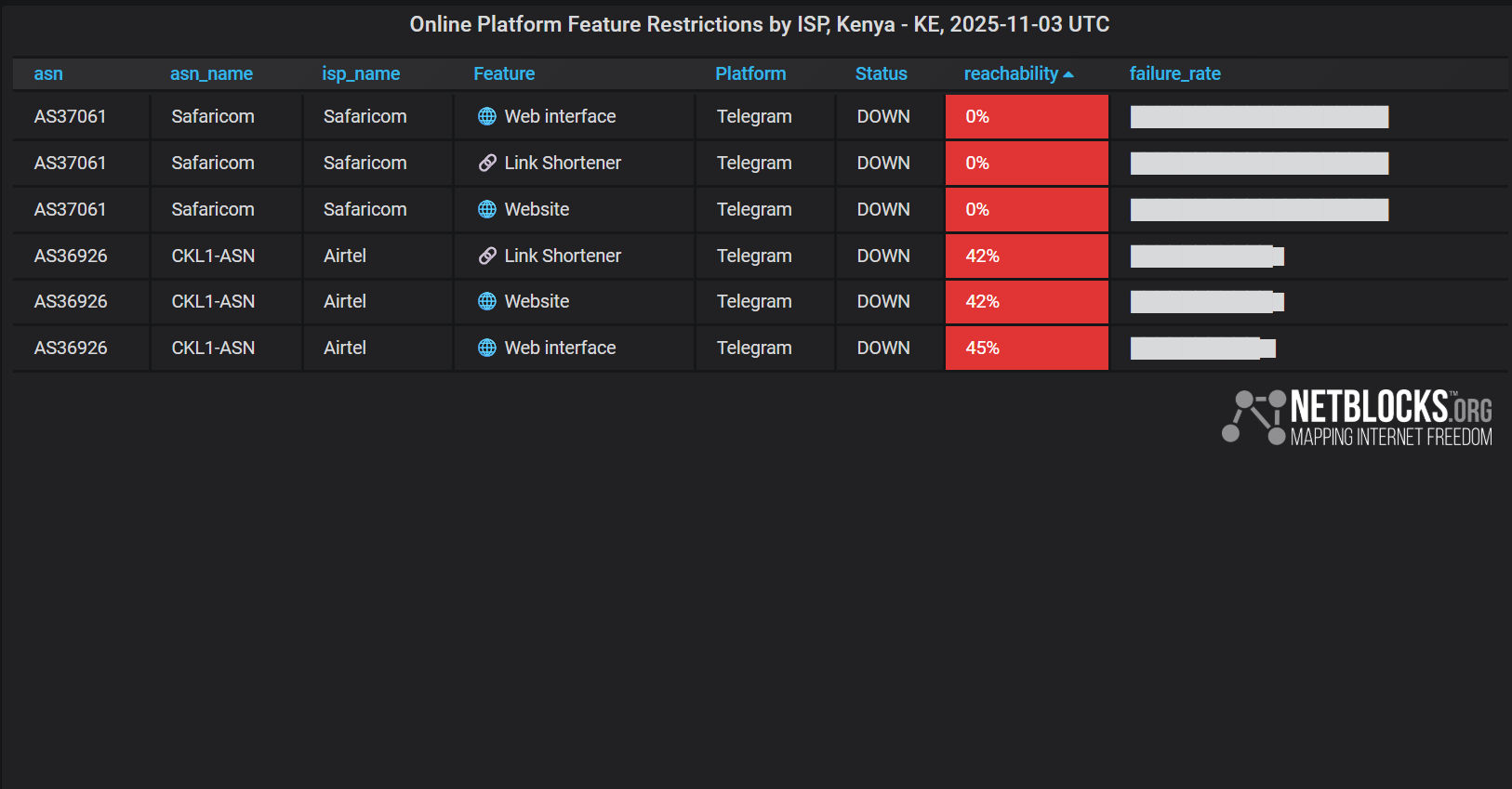 ⚠️ Confirmed: Metrics show that messaging app Telegram has been restricted in #Kenya as KCSE school exams are held, following an established pattern of internet censorship measures intended to limit cheating on exam days